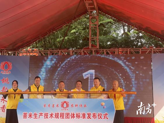 在丰收节开幕式上,正式发布推广《潭下菩米全链式生产技术规程》。该技术规程是由广东梅州职业技术学院联合五华县潭下镇经济联合总社、五华县潭下镇强镇富村实业有限公司等多家单位共同起草,在全国团体标准信息平台上发布。标准涵盖了潭下菩米从菩谷品种选择、栽培、菩米加工到质量管控的全链条技术规范。