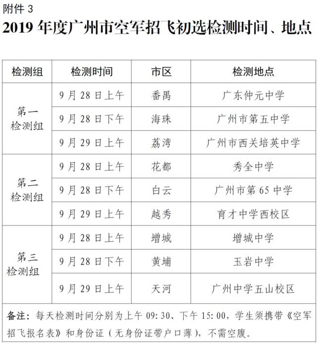 根据报名情况,招飞单位在各地市设立集中面试点对考生进行初选面试(面试时间和地点安排见附件5)。各地市考试招生机构负责组织协调和检测场地布置工作(检测场地要求见附件6)。